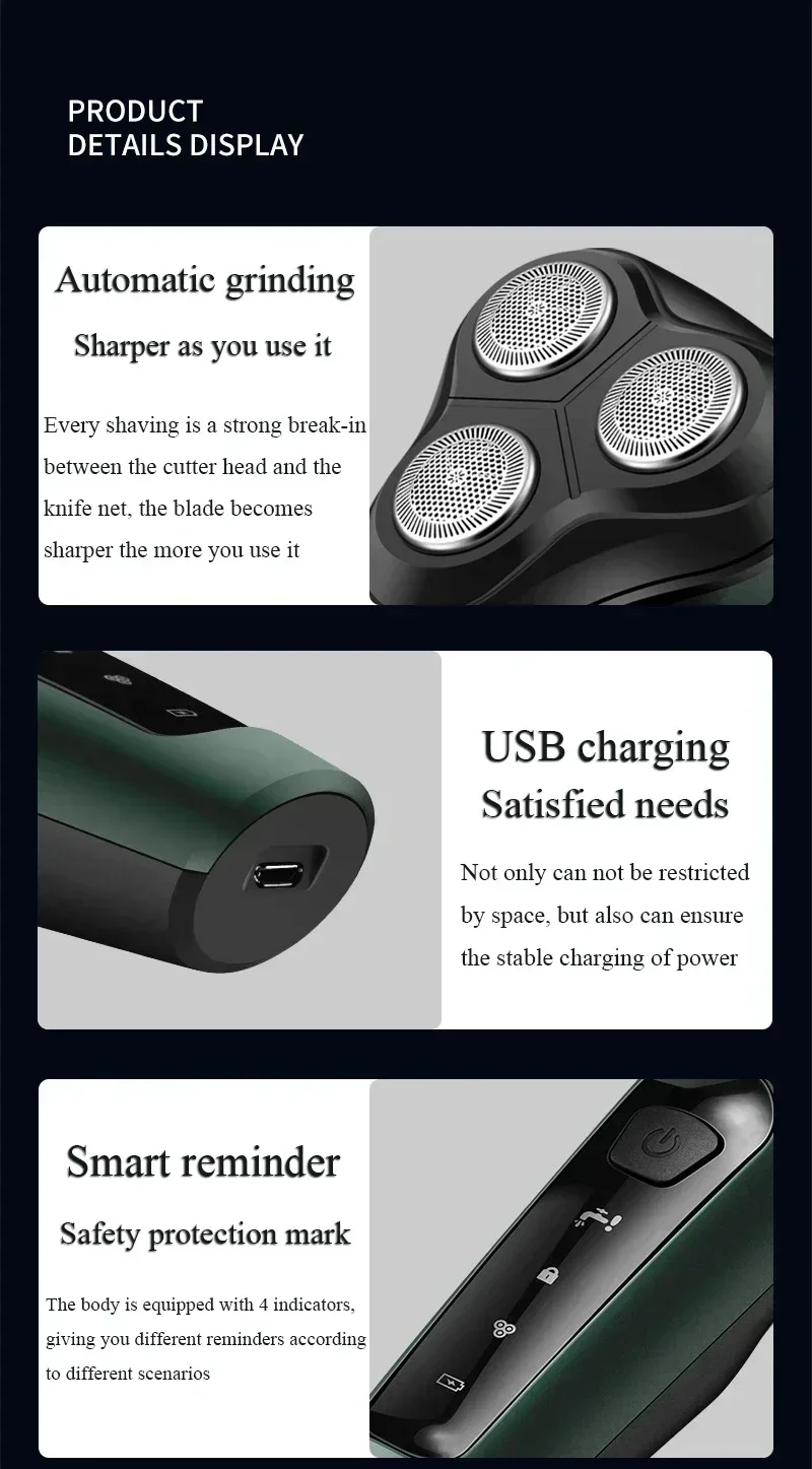 • Voltaje universal global: esta afeitadora eléctrica está diseñada para funcionar con un voltaje universal global (100-240 V), lo que la hace versátil y adecuada para su uso en varias regiones sin necesidad de un convertidor.