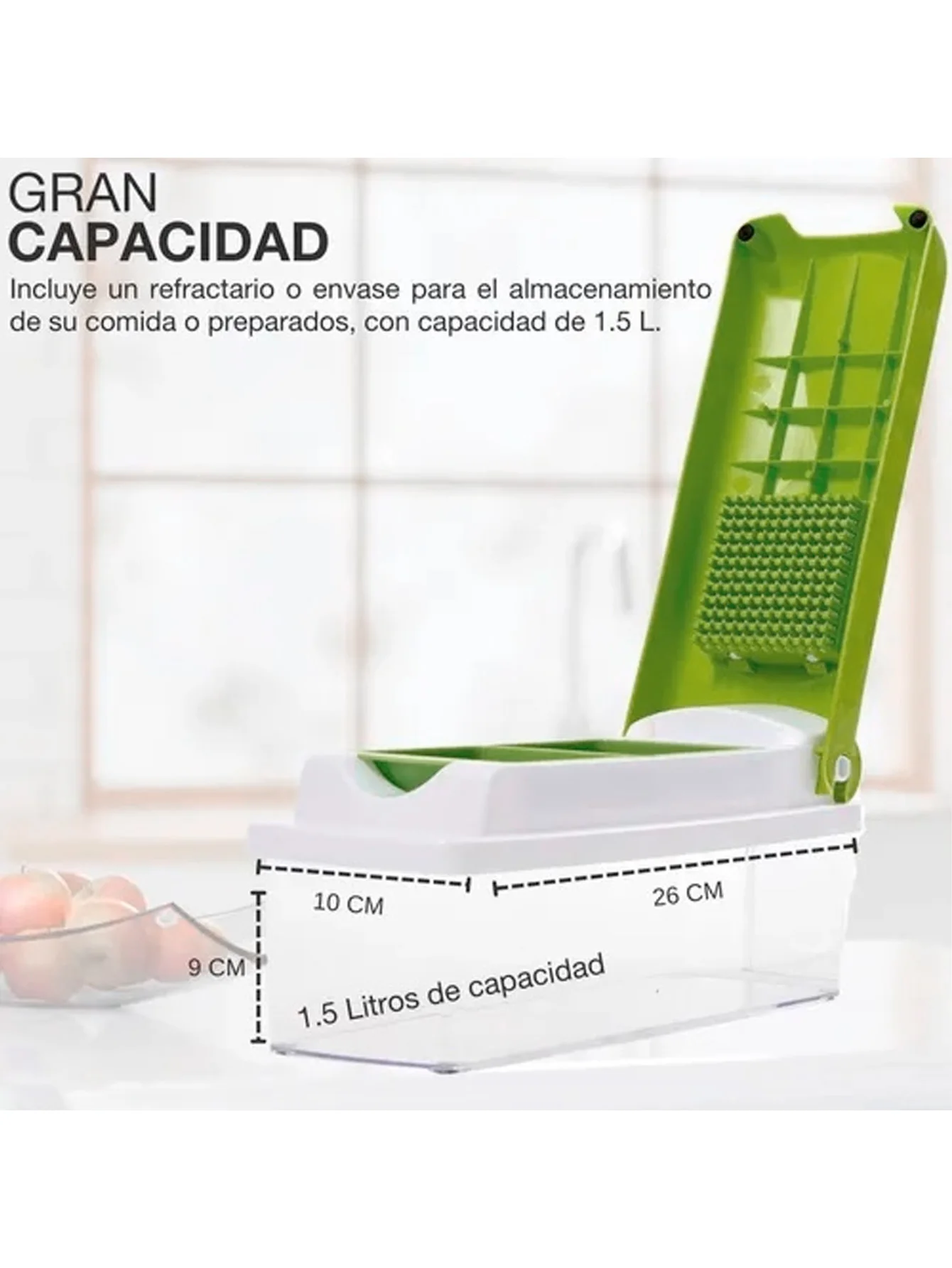 Un utensilio eficaz y eficiente para cortar, rayar, trocear, rebanar, laminar y pelar. Nuestro cortador y rayador multifuncional funciona con un simple movimiento, facilitando la preparación de tu alimentos. Equipado con cuchillas intercambiables, este utensilio se adapta a diferentes necesidades de corte , garantizando resultados precisos y uniformes. Además, es apto para lavavajillas , lo que asegura una limpieza rápida y sencilla.